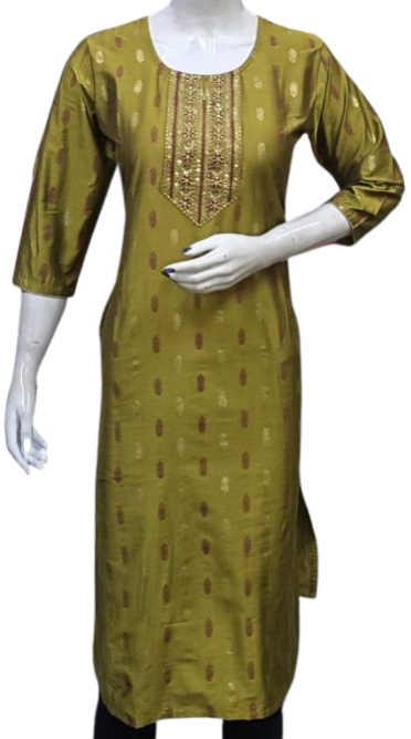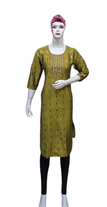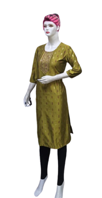 The kurti is adorned with subtle, intricate embroidery that adds a touch of grace and refinement. The small embroidery patterns are thoughtfully placed, creating a harmonious balance that enhances the overall design without overwhelming its simplicity. This design approach makes it versatile, suitable for festive gatherings, casual outings, or even formal office wear.