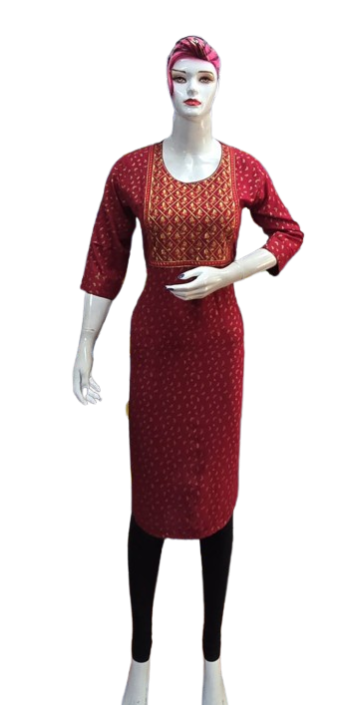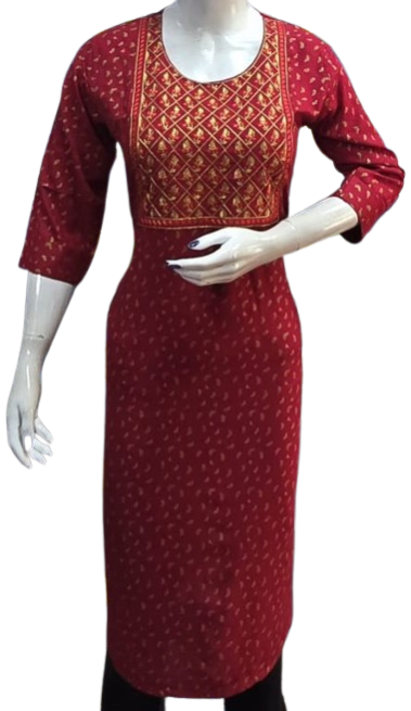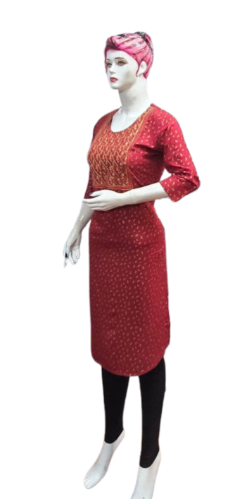 Crafted with premium-quality fabric, it offers unmatched comfort and breathability, ensuring you feel as good as you look. The embroidery design enhances the aesthetic appeal, creating a stunning contrast against the kurti's base color, making it perfect for casual outings, festive celebrations, or office wear.