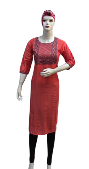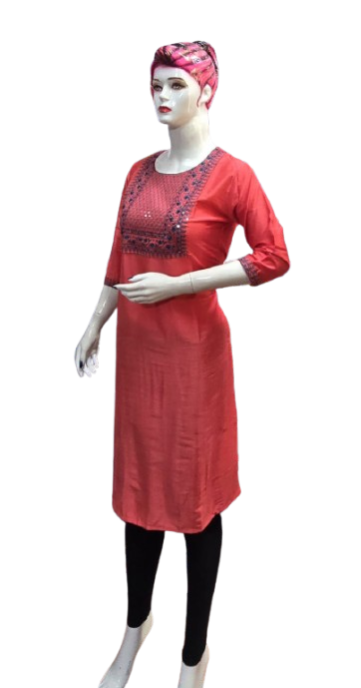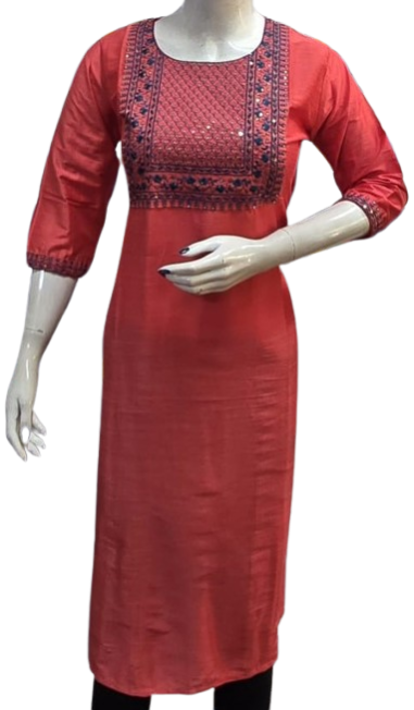 Crafted with premium-quality fabric, it offers unmatched comfort and breathability, ensuring you feel as good as you look. The embroidery design enhances the aesthetic appeal, creating a stunning contrast against the kurti's base color, making it perfect for casual outings, festive celebrations, or office wear.