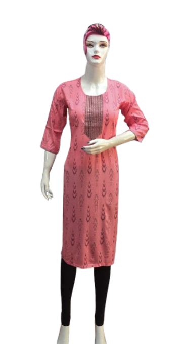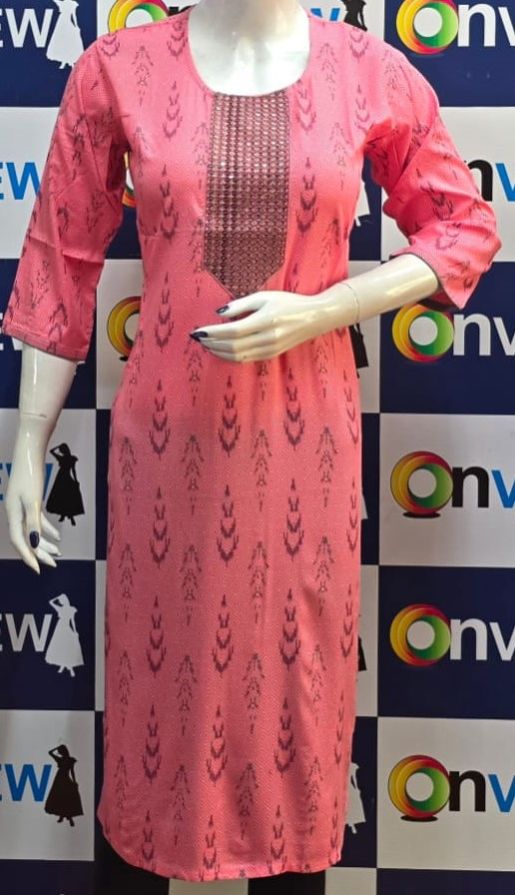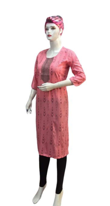 The kurti is adorned with subtle, intricate embroidery that adds a touch of grace and refinement. The small embroidery patterns are thoughtfully placed, creating a harmonious balance that enhances the overall design without overwhelming its simplicity. This design approach makes it versatile, suitable for festive gatherings, casual outings, or even formal office wear.