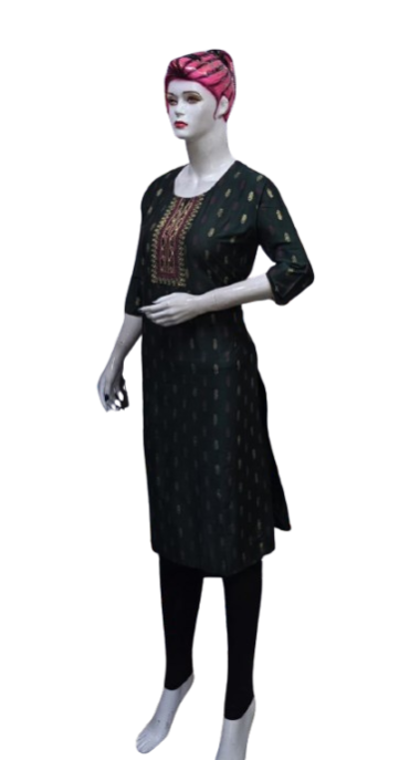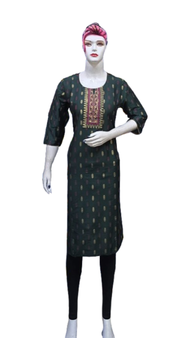 The kurti is adorned with subtle, intricate embroidery that adds a touch of grace and refinement. The small embroidery patterns are thoughtfully placed, creating a harmonious balance that enhances the overall design without overwhelming its simplicity. This design approach makes it versatile, suitable for festive gatherings, casual outings, or even formal office wear.