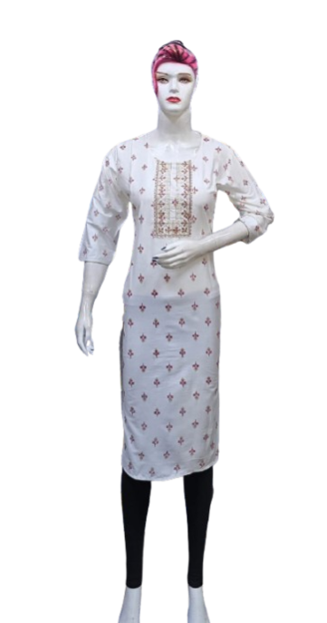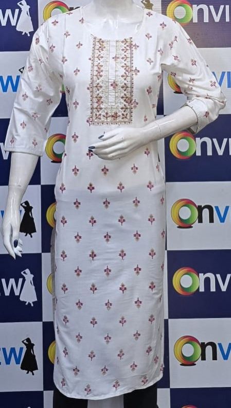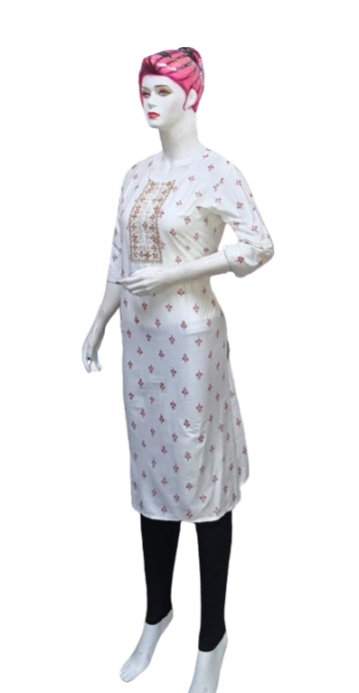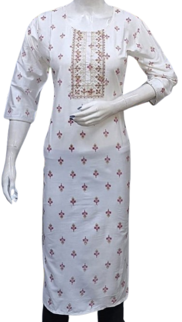 The kurti is adorned with subtle, intricate embroidery that adds a touch of grace and refinement. The small embroidery patterns are thoughtfully placed, creating a harmonious balance that enhances the overall design without overwhelming its simplicity. This design approach makes it versatile, suitable for festive gatherings, casual outings, or even formal office wear.