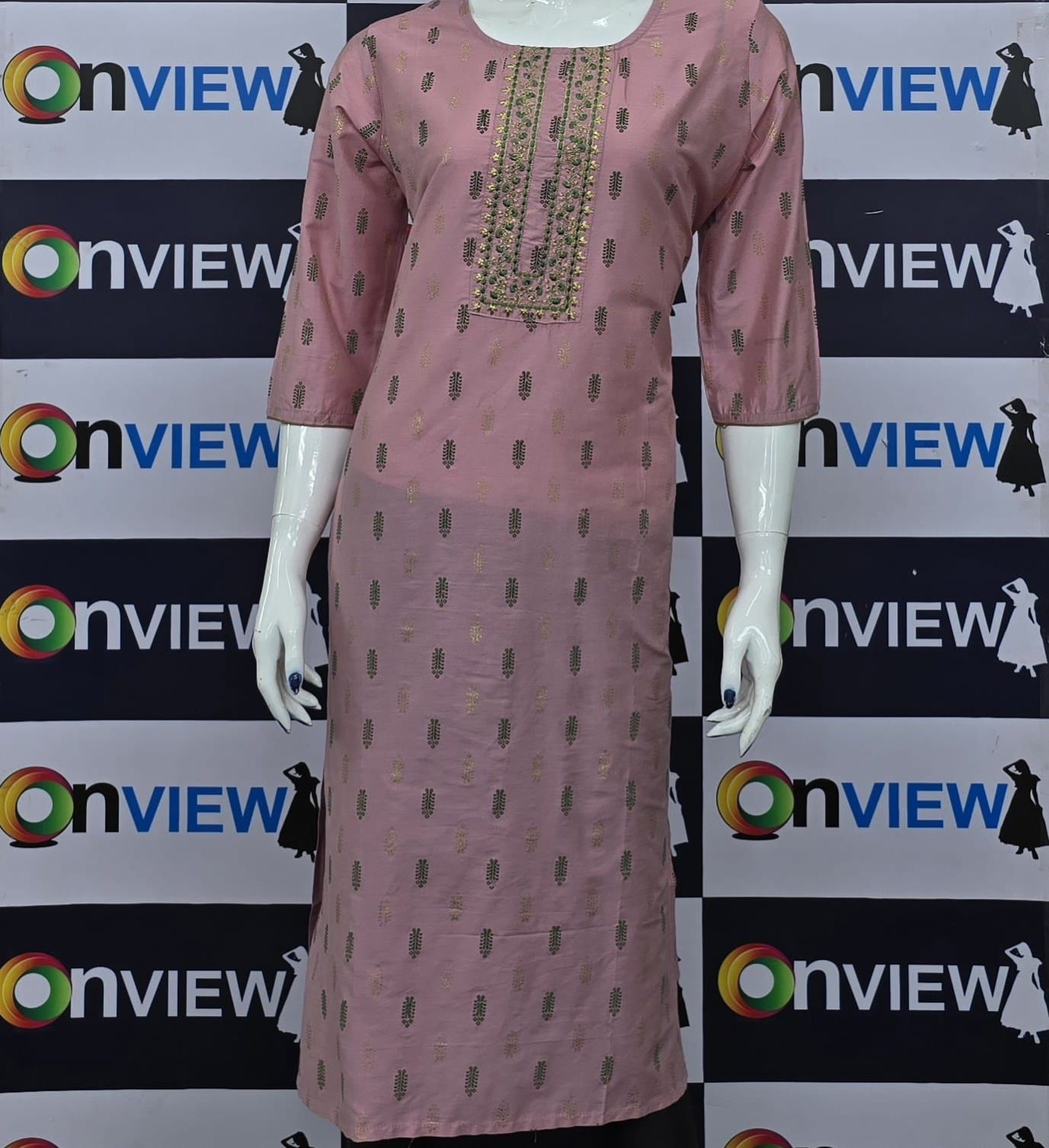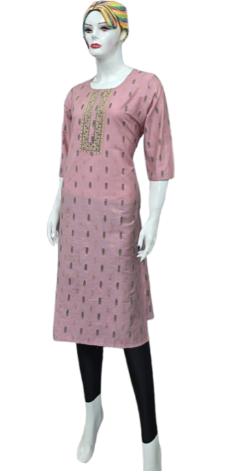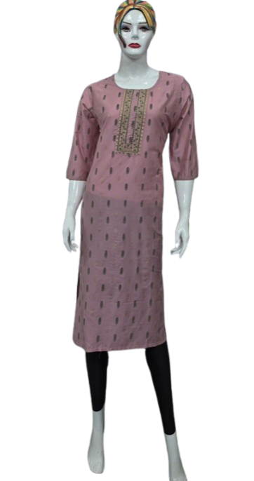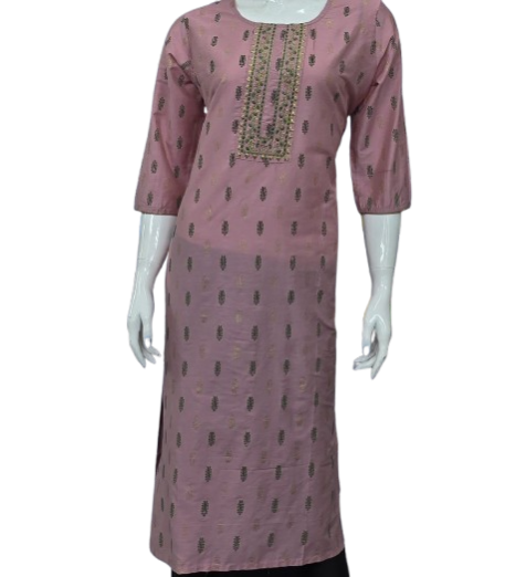 The kurti is adorned with subtle, intricate embroidery that adds a touch of grace and refinement. The small embroidery patterns are thoughtfully placed, creating a harmonious balance that enhances the overall design without overwhelming its simplicity. This design approach makes it versatile, suitable for festive gatherings, casual outings, or even formal office wear.