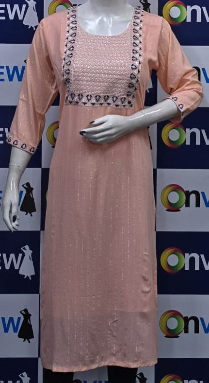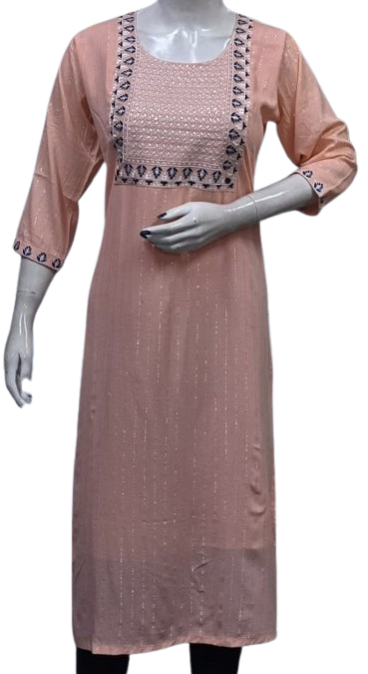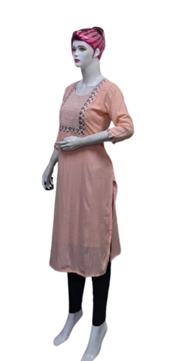 The kurti's tailored fit and flattering silhouette suit all body types, ensuring that you look your best on every occasion. It pairs effortlessly with a variety of bottoms such as leggings, palazzos, or churidars, allowing you to experiment with different styles. Whether accessorized with traditional jewelry or kept minimal, this kurti is a versatile addition to any wardrobe.