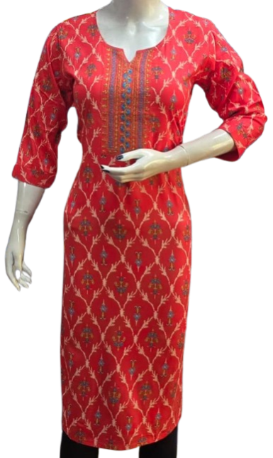 The kurti is adorned with subtle, intricate embroidery that adds a touch of grace and refinement. The small embroidery patterns are thoughtfully placed, creating a harmonious balance that enhances the overall design without overwhelming its simplicity. This design approach makes it versatile, suitable for festive gatherings, casual outings, or even formal office wear.