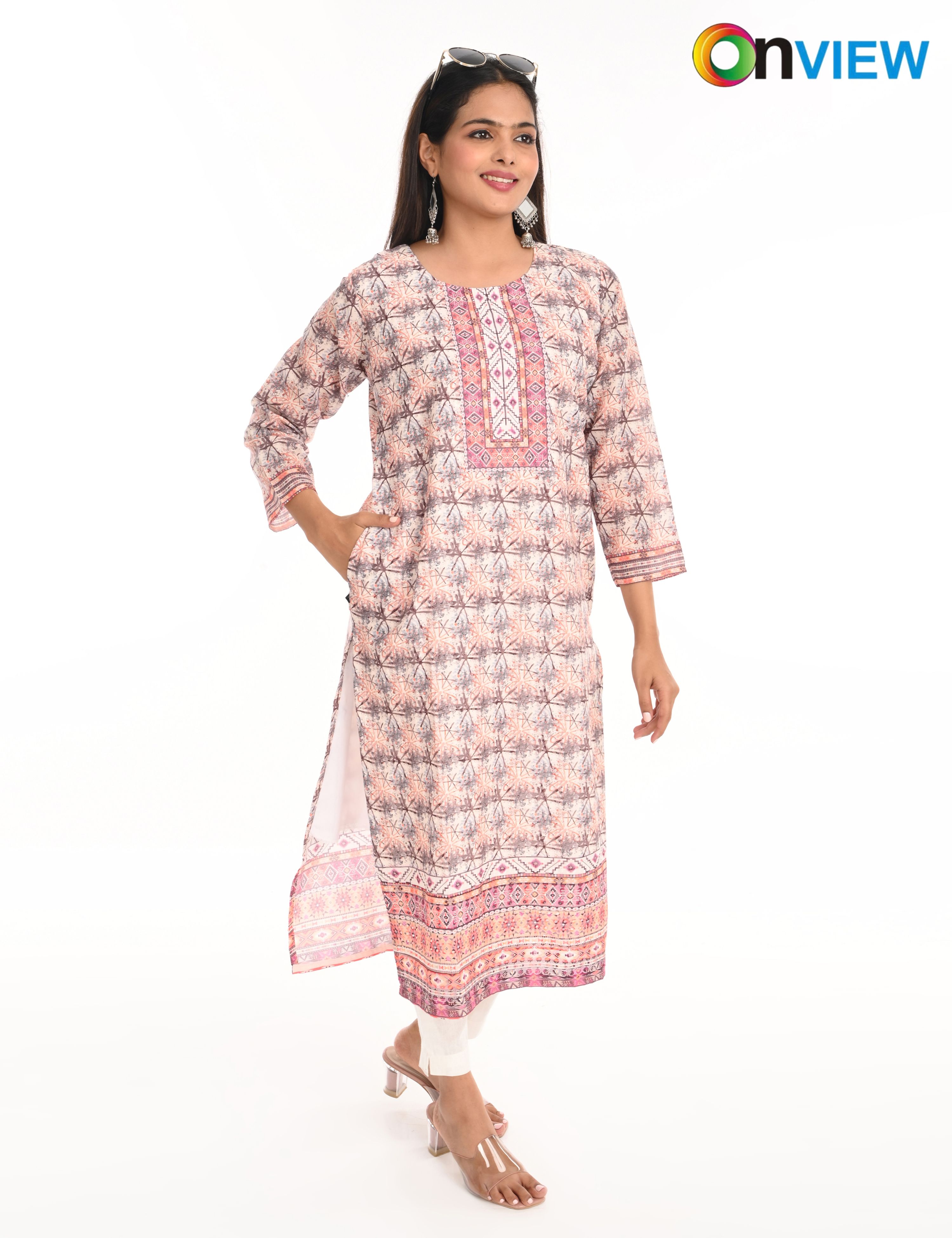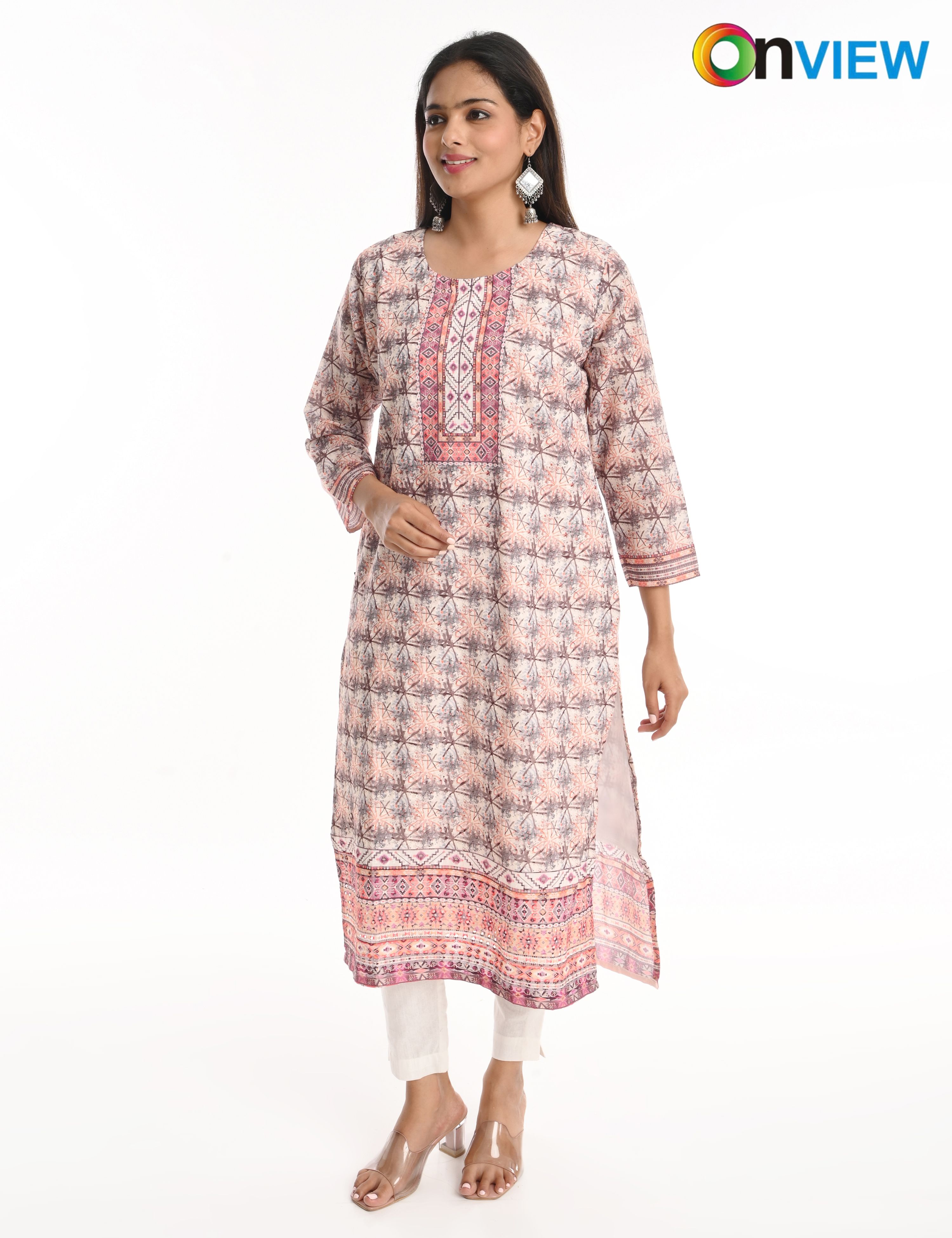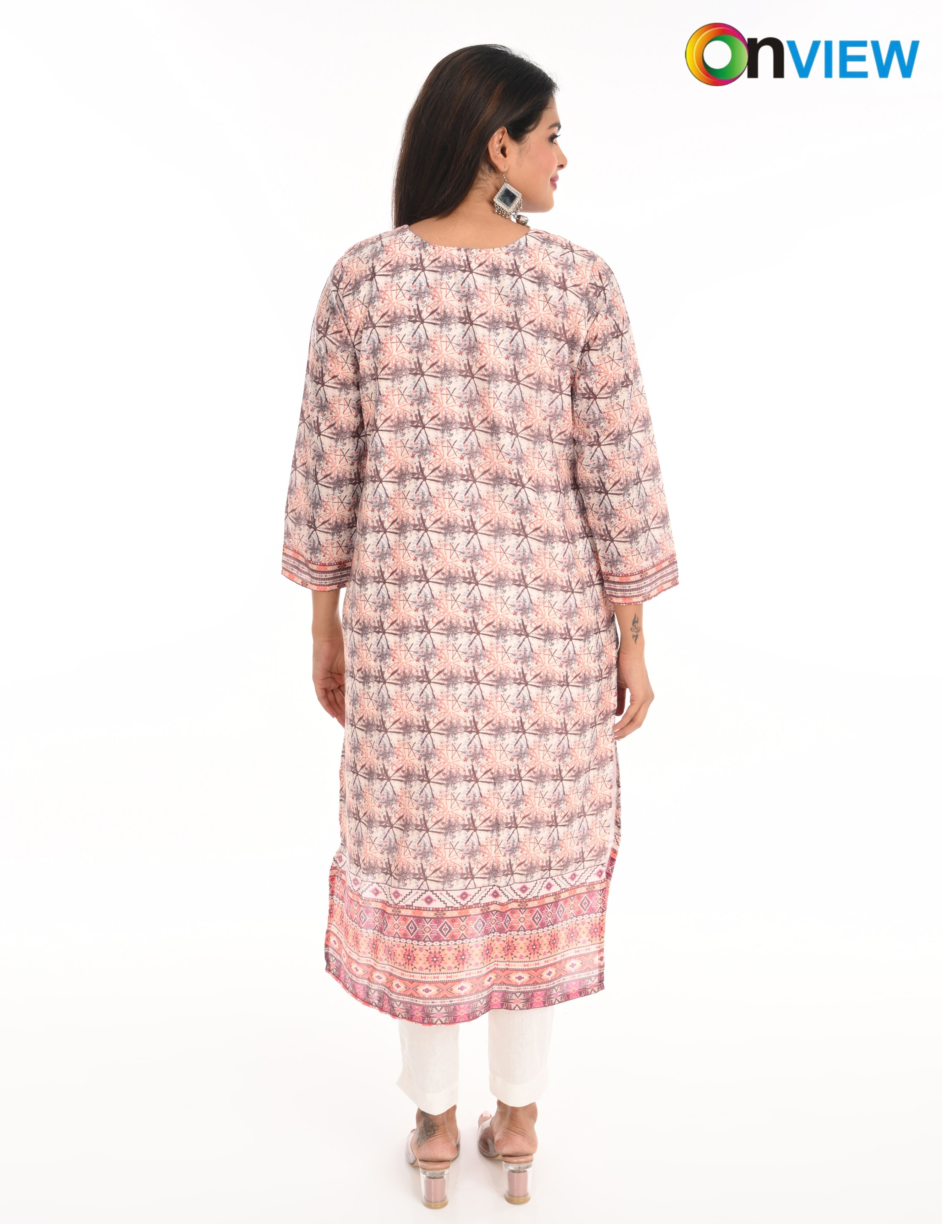 The Onview Cotton Chikankari Work With Digital Print is a sophisticated blend of luxurious fabric and delicate craftsmanship, designed to elevate your style effortlessly. Made from premium-quality silk, this kurti boasts a rich texture and an elegant sheen that exudes opulence, making it a perfect choice for special occasions or everyday elegance.