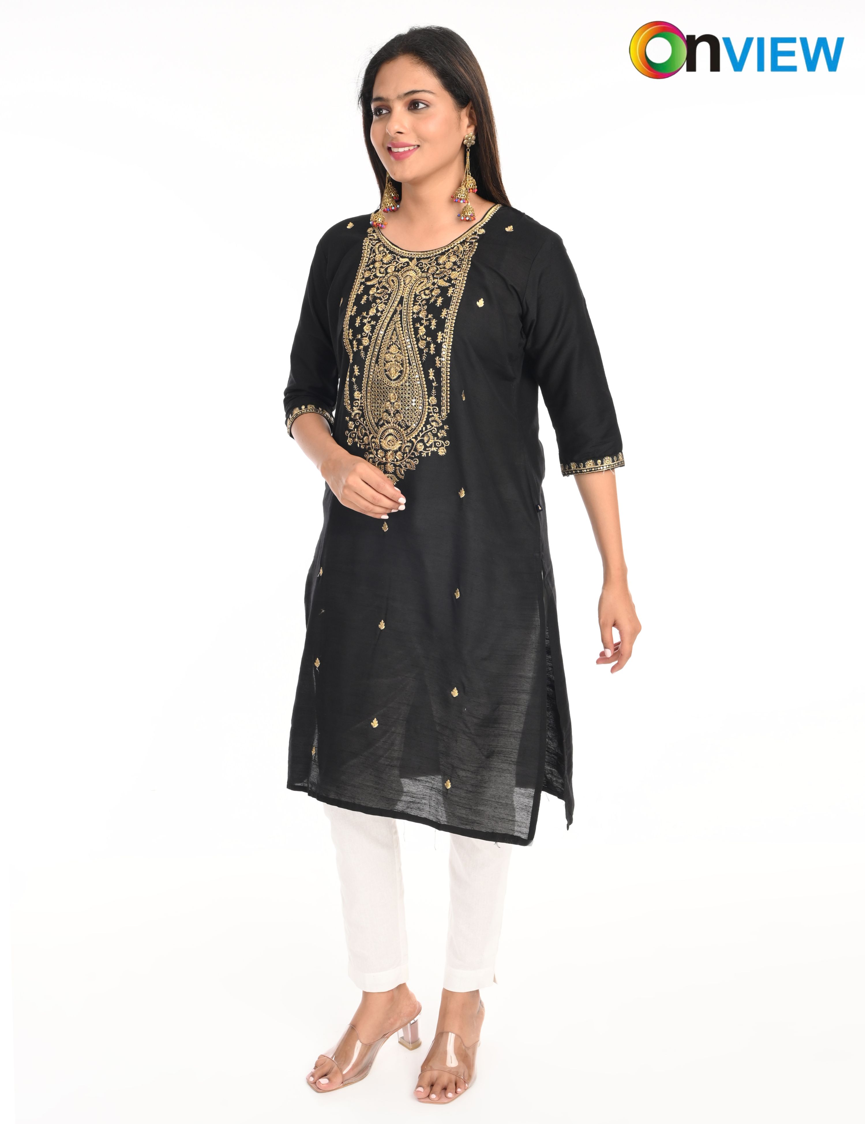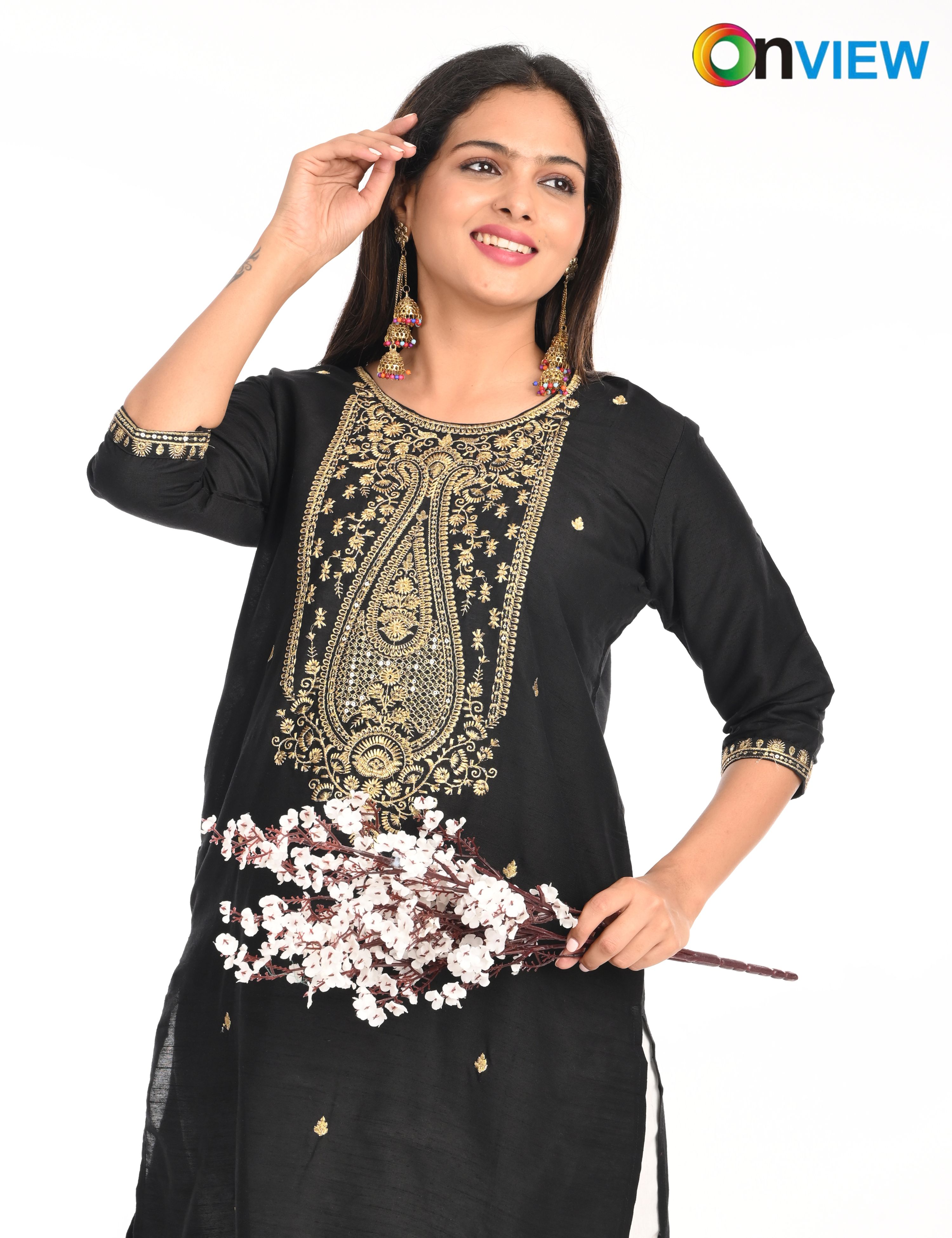 The Onview Slub Boutique Work Embroidery is a sophisticated blend of luxurious fabric and delicate craftsmanship, designed to elevate your style effortlessly. Made from premium-quality silk, this kurti boasts a rich texture and an elegant sheen that exudes opulence, making it a perfect choice for special occasions or everyday elegance.