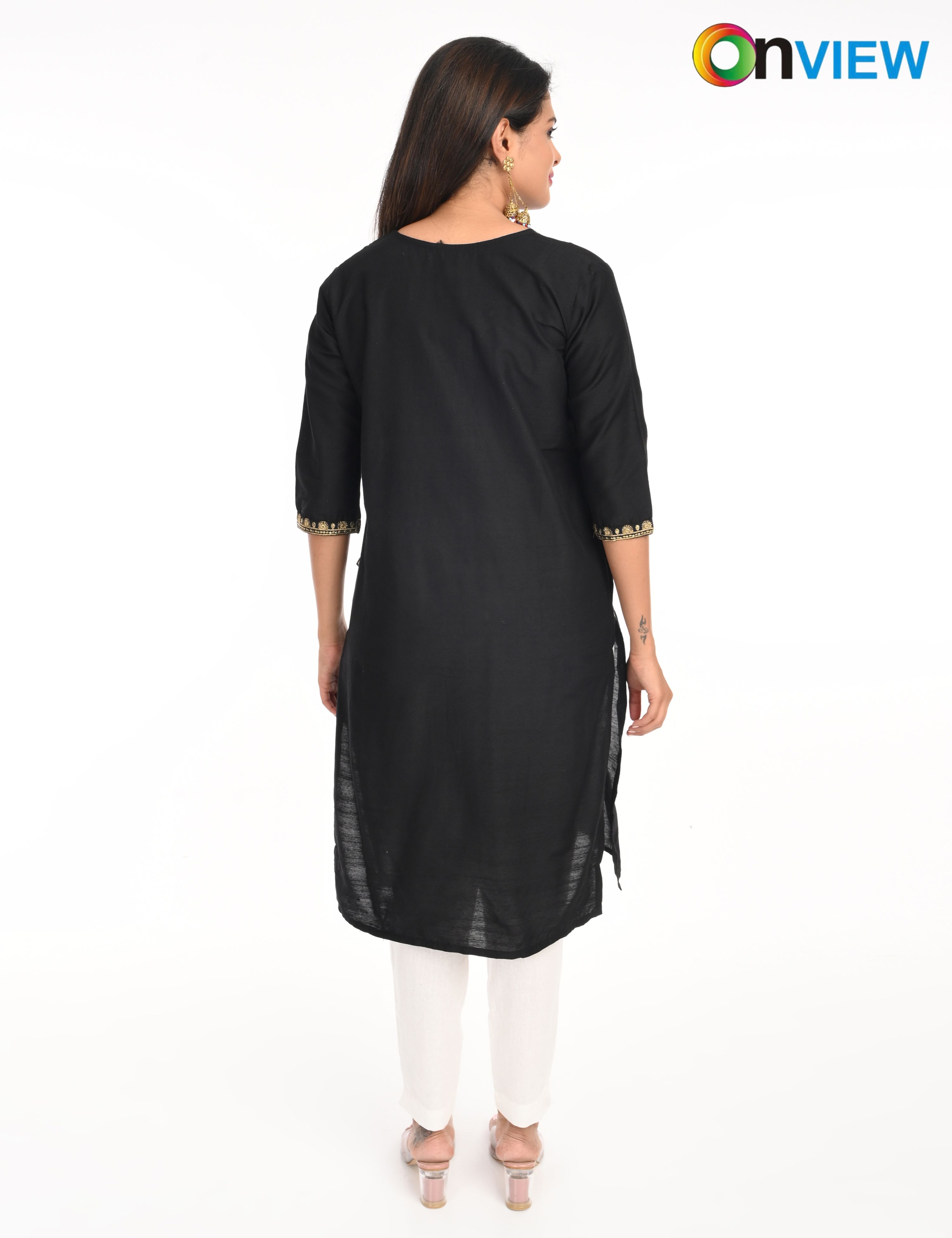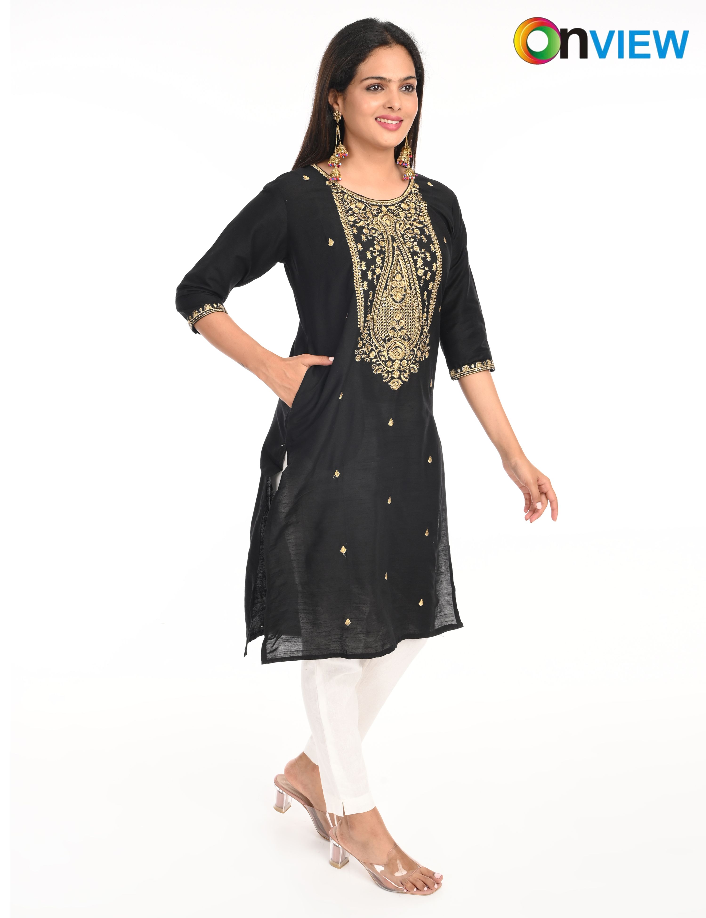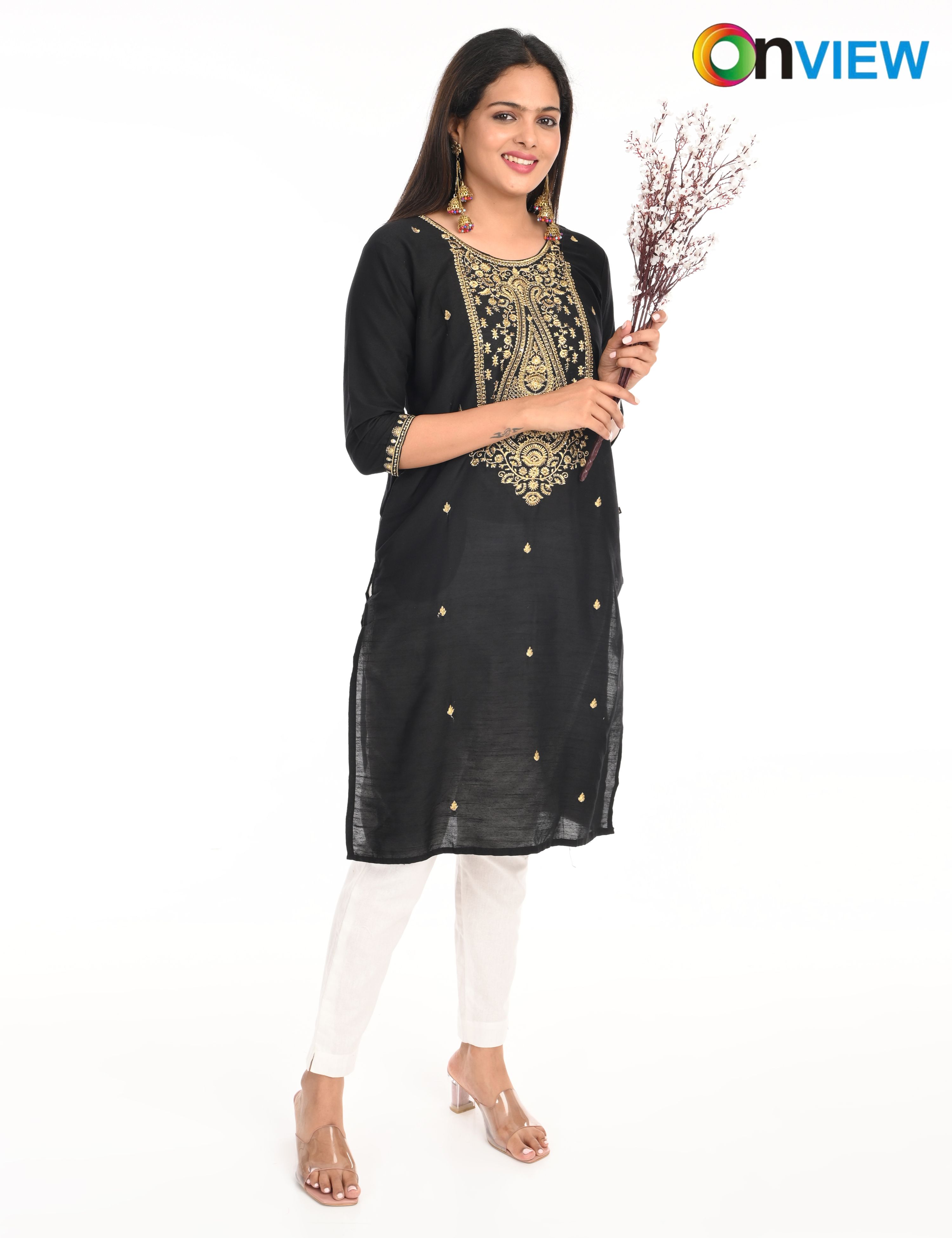 The kurti is adorned with subtle, intricate embroidery that adds a touch of grace and refinement. The small embroidery patterns are thoughtfully placed, creating a harmonious balance that enhances the overall design without overwhelming its simplicity. This design approach makes it versatile, suitable for festive gatherings, casual outings, or even formal office wear.