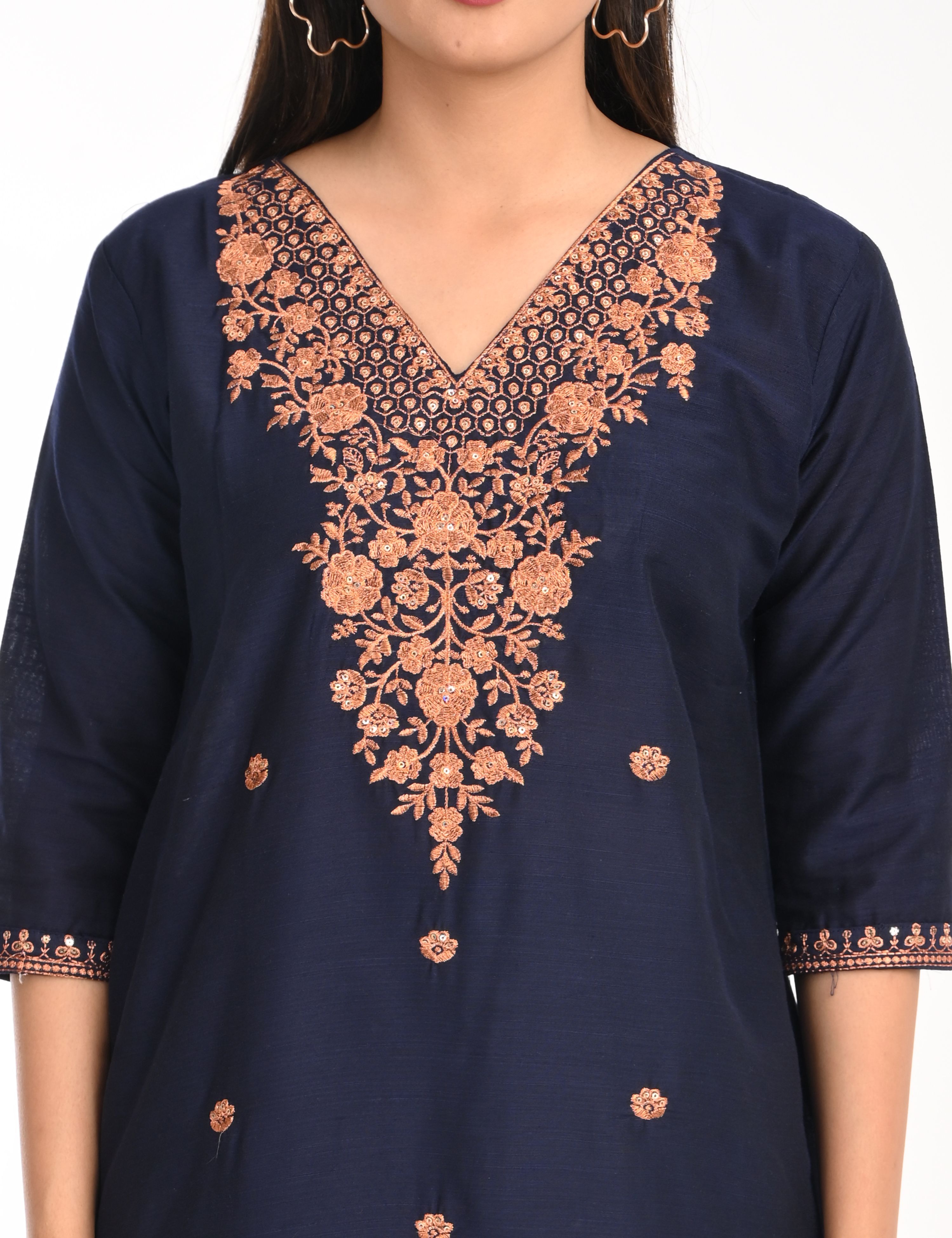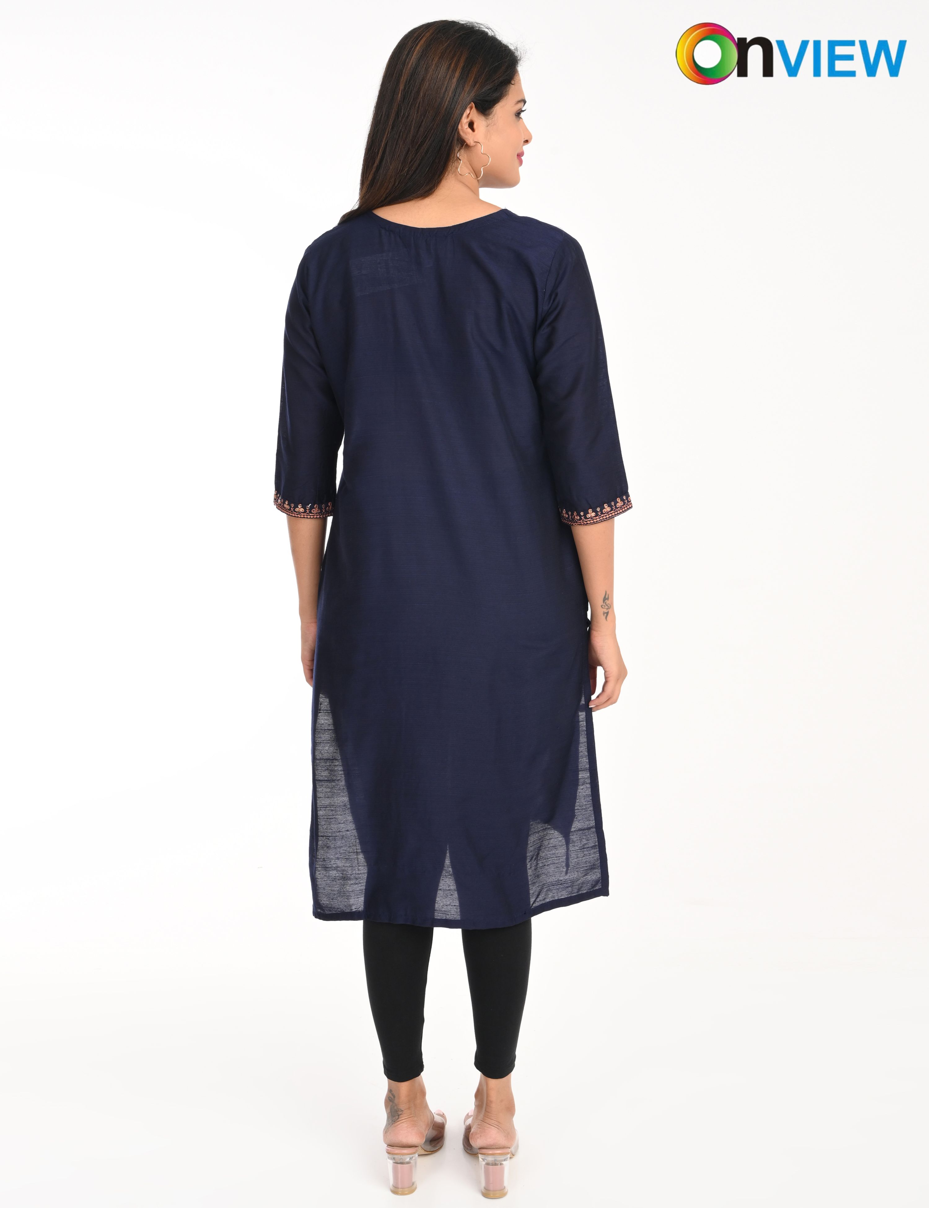 The kurti is adorned with subtle, intricate embroidery that adds a touch of grace and refinement. The small embroidery patterns are thoughtfully placed, creating a harmonious balance that enhances the overall design without overwhelming its simplicity. This design approach makes it versatile, suitable for festive gatherings, casual outings, or even formal office wear.