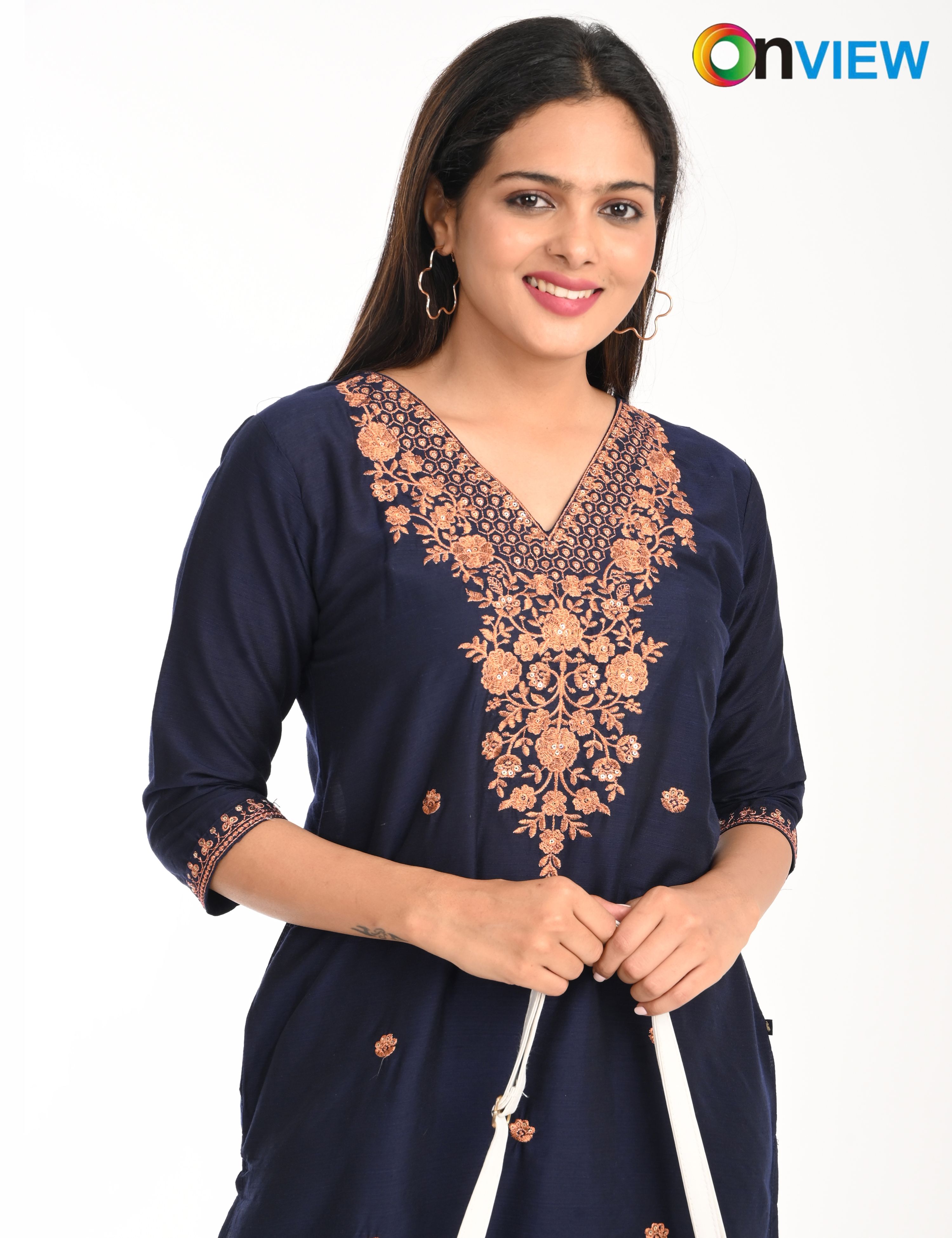 The Onview Slub Boutique Work Embroidery is a sophisticated blend of luxurious fabric and delicate craftsmanship, designed to elevate your style effortlessly. Made from premium-quality silk, this kurti boasts a rich texture and an elegant sheen that exudes opulence, making it a perfect choice for special occasions or everyday elegance.