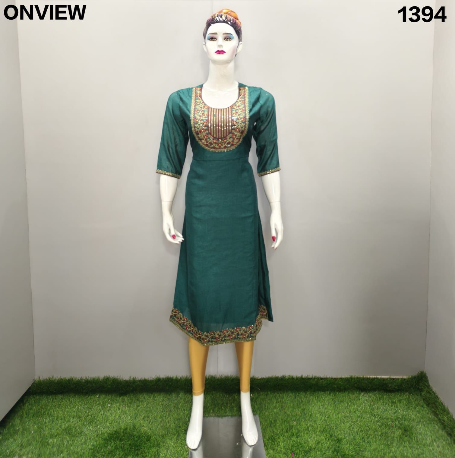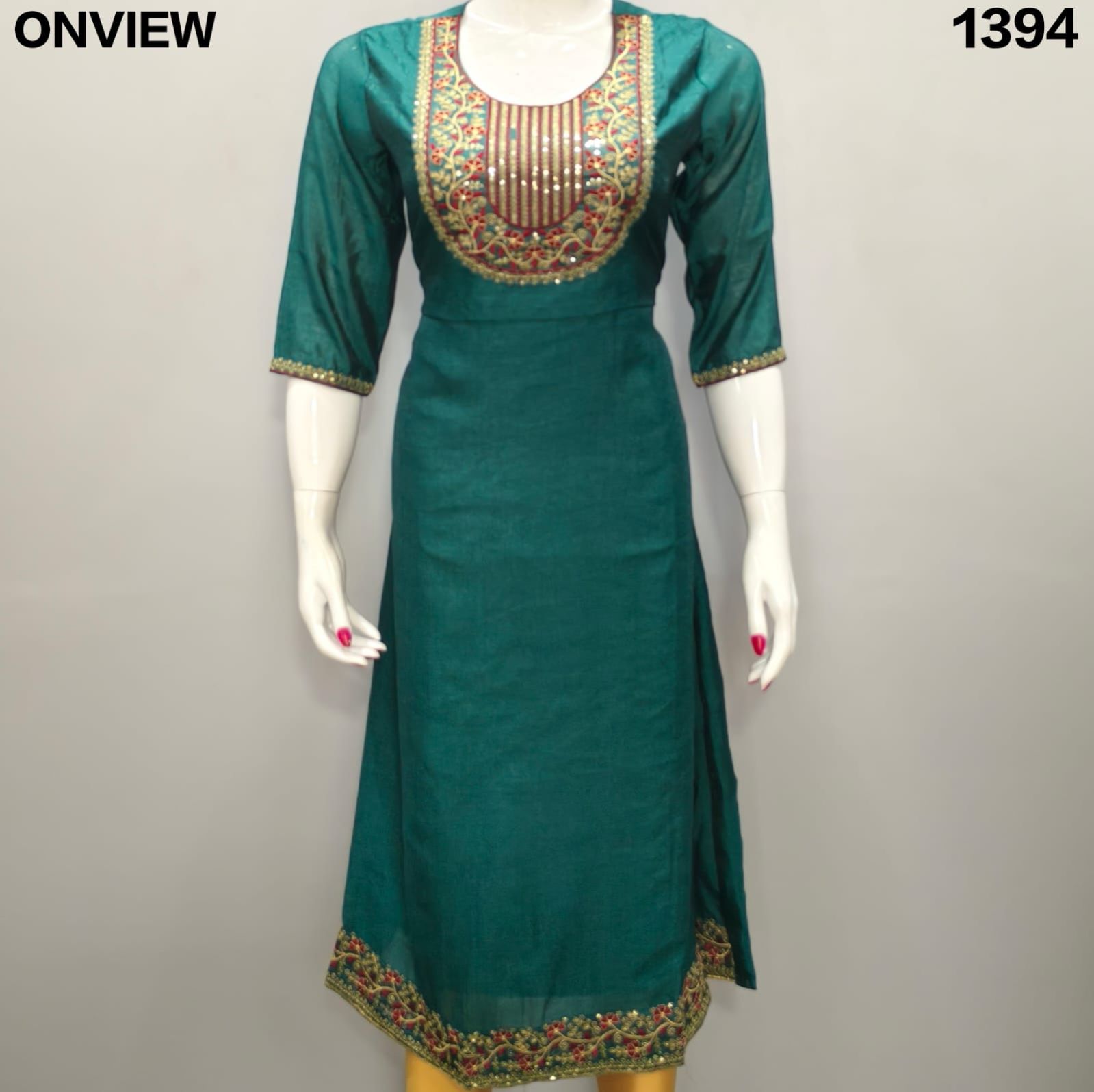 The kurti is adorned with subtle, intricate embroidery that adds a touch of grace and refinement. The small embroidery patterns are thoughtfully placed, creating a harmonious balance that enhances the overall design without overwhelming its simplicity. This design approach makes it versatile, suitable for festive gatherings, casual outings, or even formal office wear.