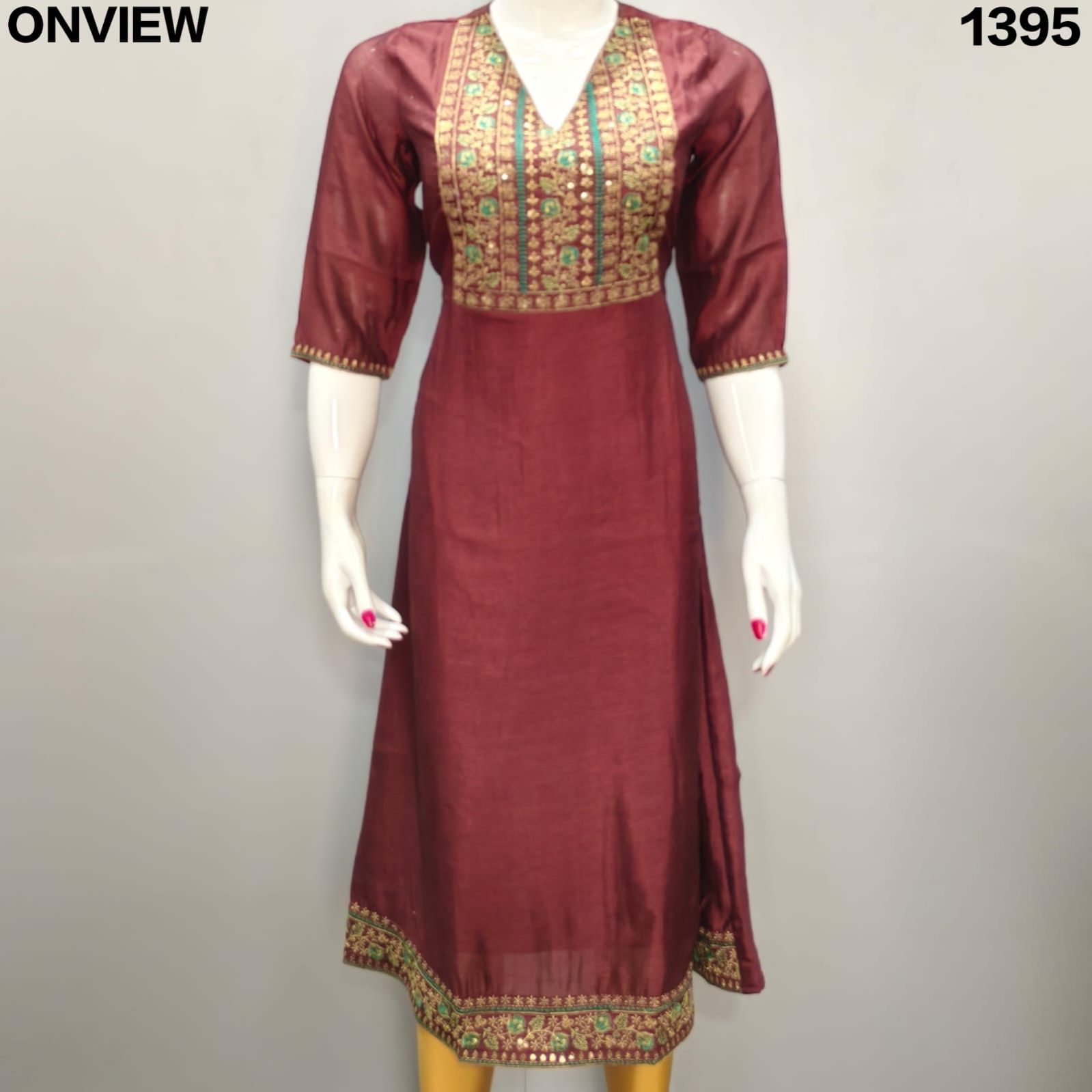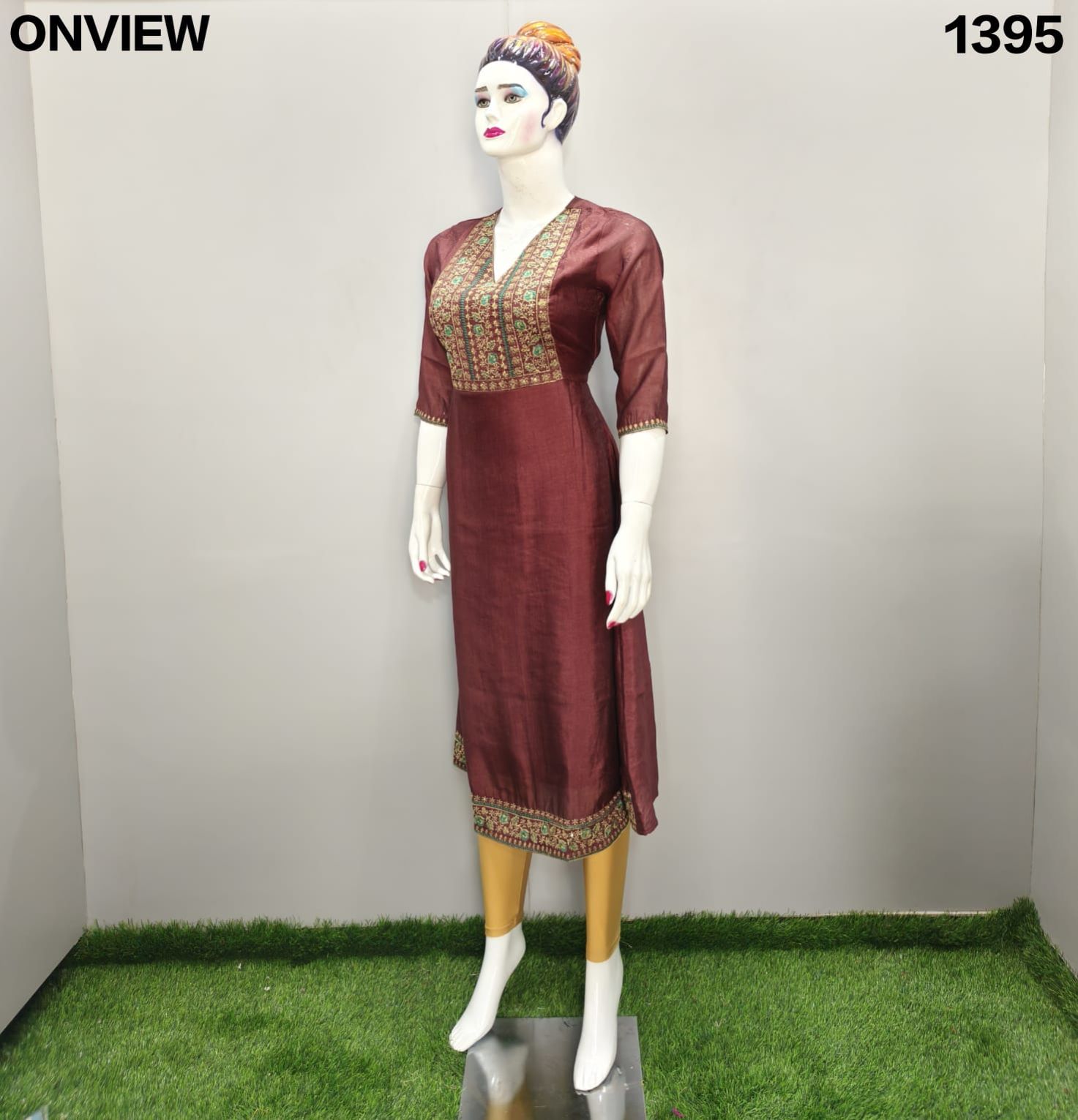 The kurti is adorned with subtle, intricate embroidery that adds a touch of grace and refinement. The small embroidery patterns are thoughtfully placed, creating a harmonious balance that enhances the overall design without overwhelming its simplicity. This design approach makes it versatile, suitable for festive gatherings, casual outings, or even formal office wear.