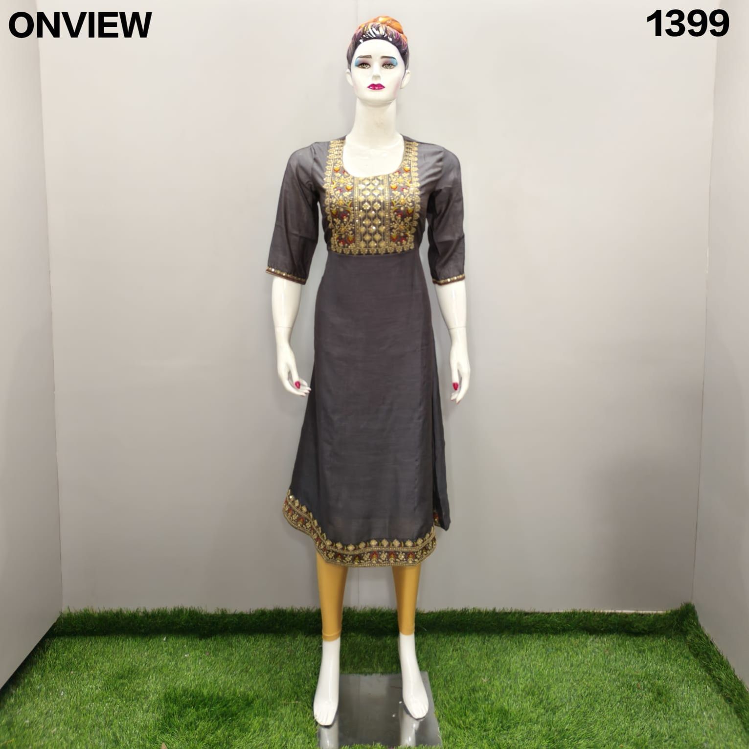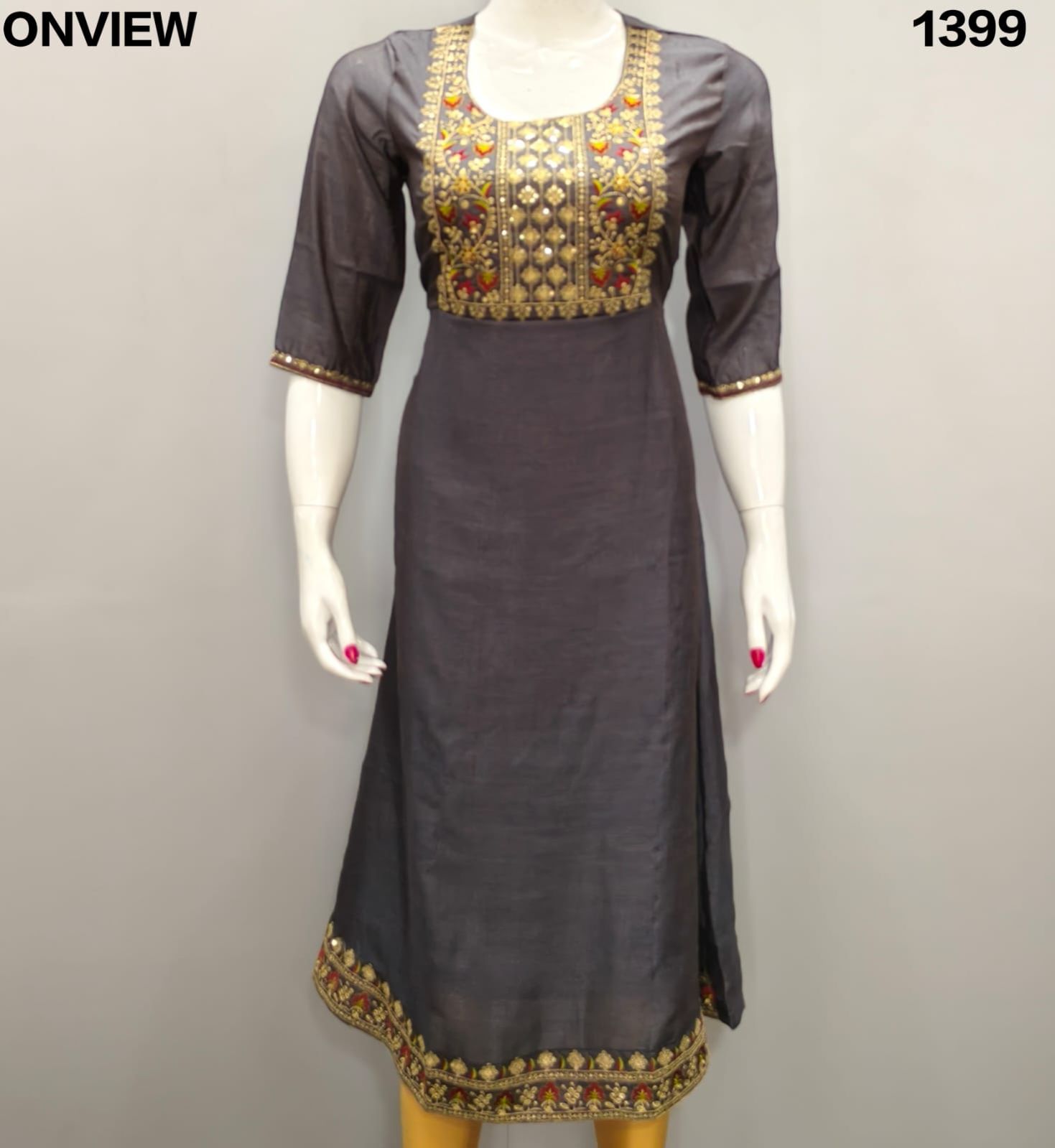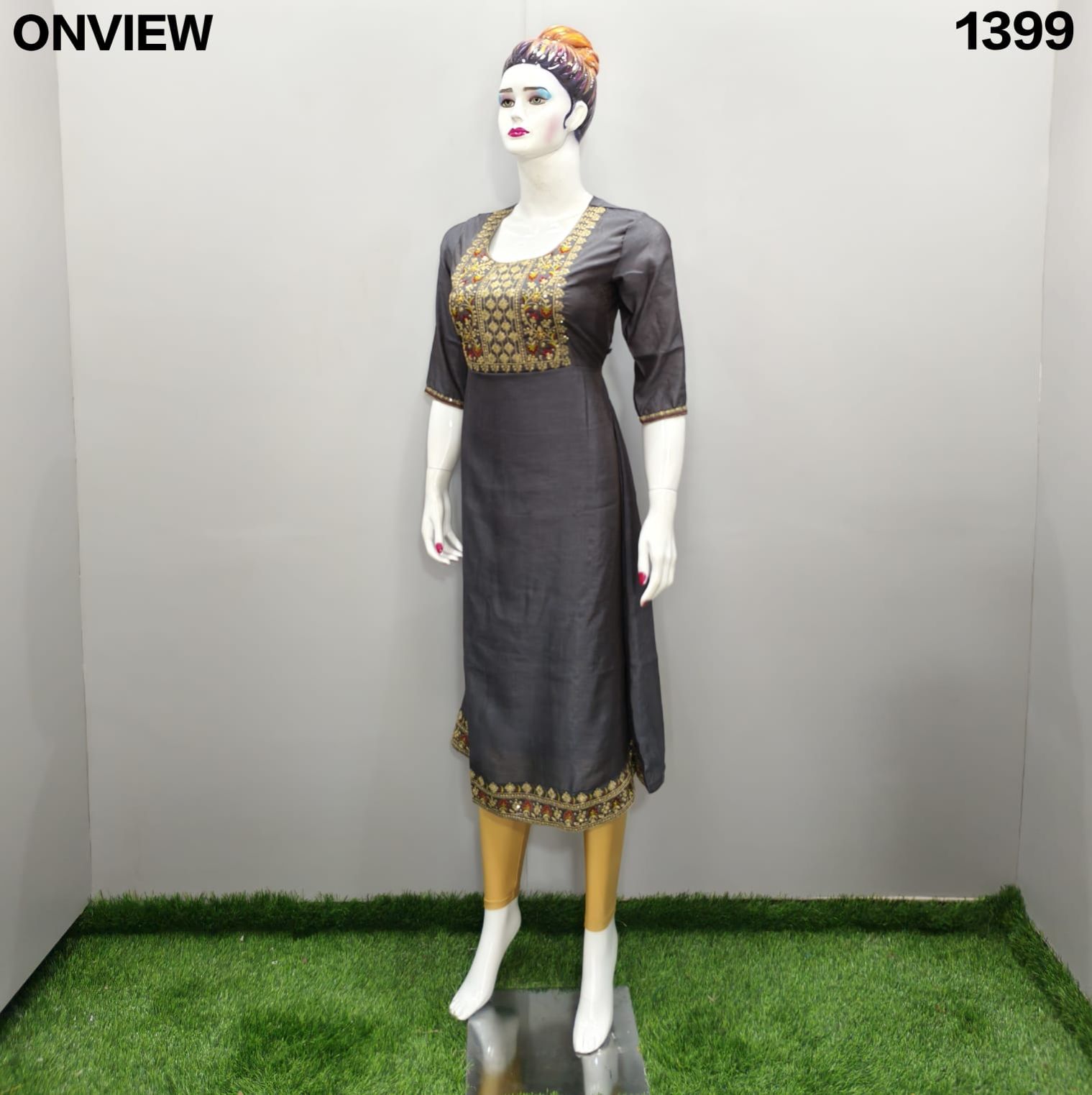 The kurti is adorned with subtle, intricate embroidery that adds a touch of grace and refinement. The small embroidery patterns are thoughtfully placed, creating a harmonious balance that enhances the overall design without overwhelming its simplicity. This design approach makes it versatile, suitable for festive gatherings, casual outings, or even formal office wear.