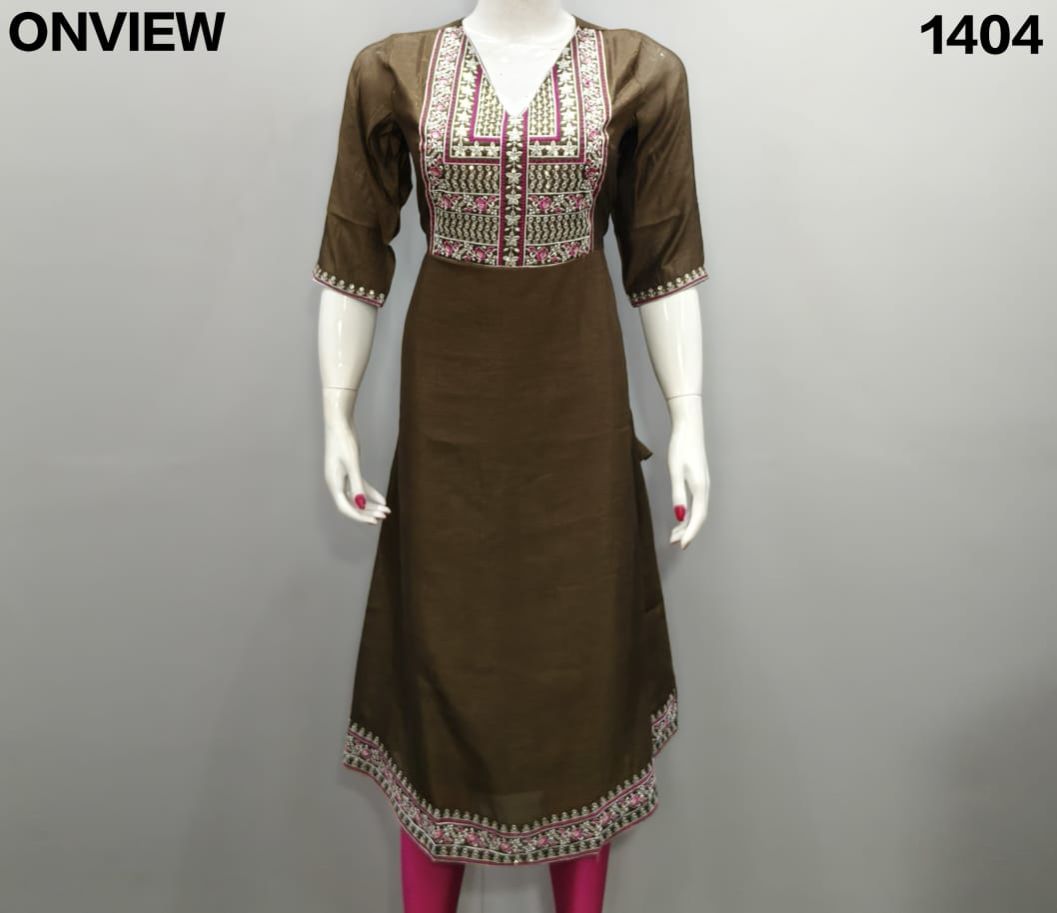 The kurti is adorned with subtle, intricate embroidery that adds a touch of grace and refinement. The small embroidery patterns are thoughtfully placed, creating a harmonious balance that enhances the overall design without overwhelming its simplicity. This design approach makes it versatile, suitable for festive gatherings, casual outings, or even formal office wear.