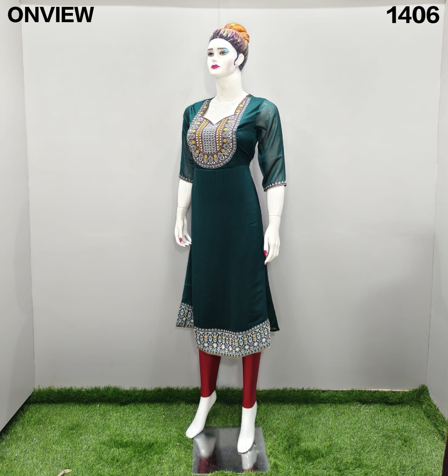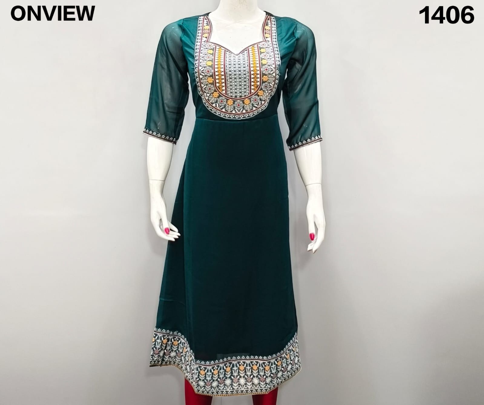 The kurti is adorned with subtle, intricate embroidery that adds a touch of grace and refinement. The small embroidery patterns are thoughtfully placed, creating a harmonious balance that enhances the overall design without overwhelming its simplicity. This design approach makes it versatile, suitable for festive gatherings, casual outings, or even formal office wear.