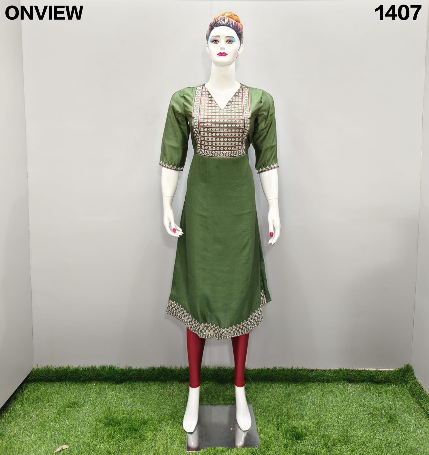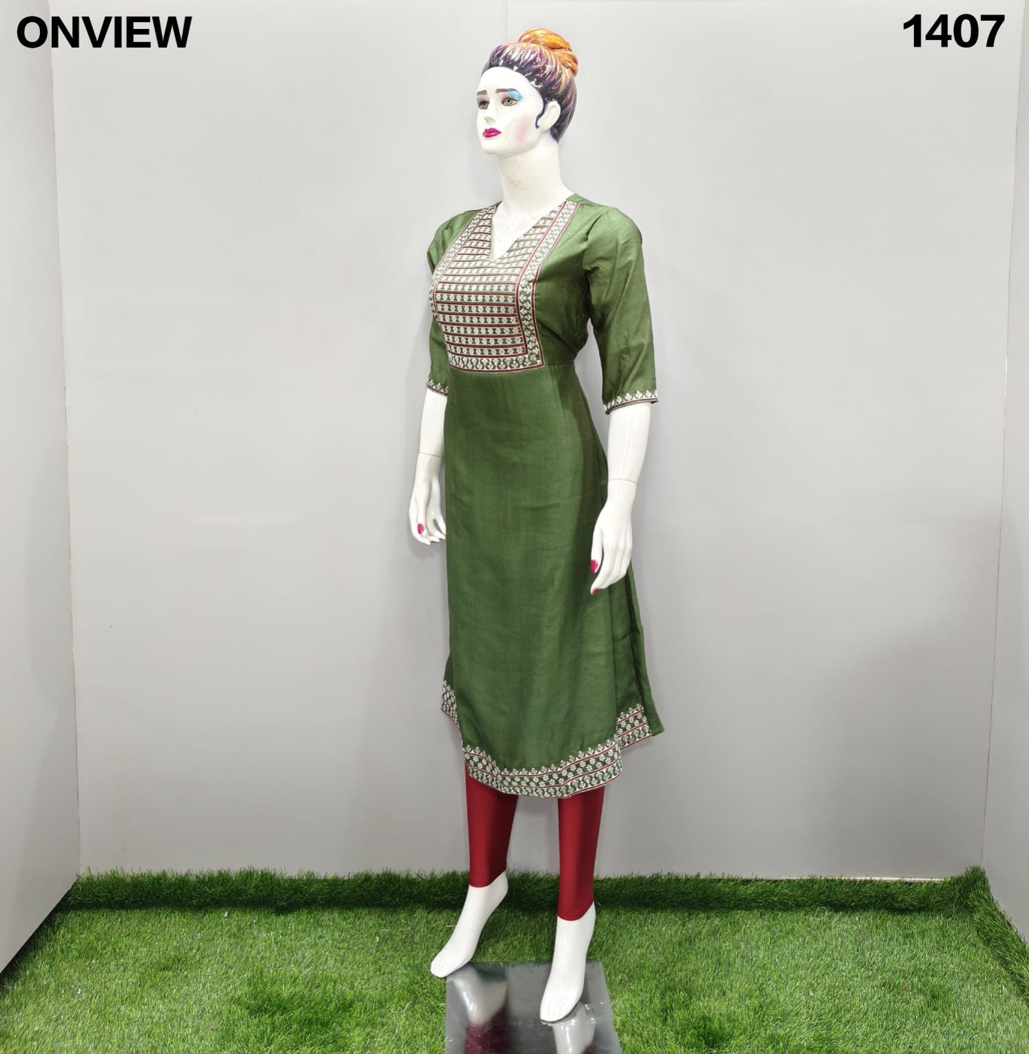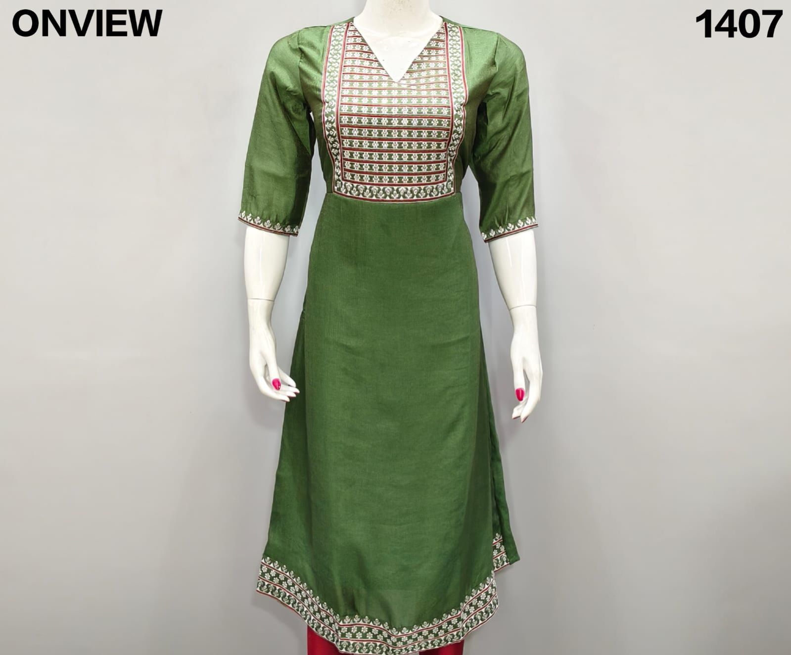 The kurti is adorned with subtle, intricate embroidery that adds a touch of grace and refinement. The small embroidery patterns are thoughtfully placed, creating a harmonious balance that enhances the overall design without overwhelming its simplicity. This design approach makes it versatile, suitable for festive gatherings, casual outings, or even formal office wear.