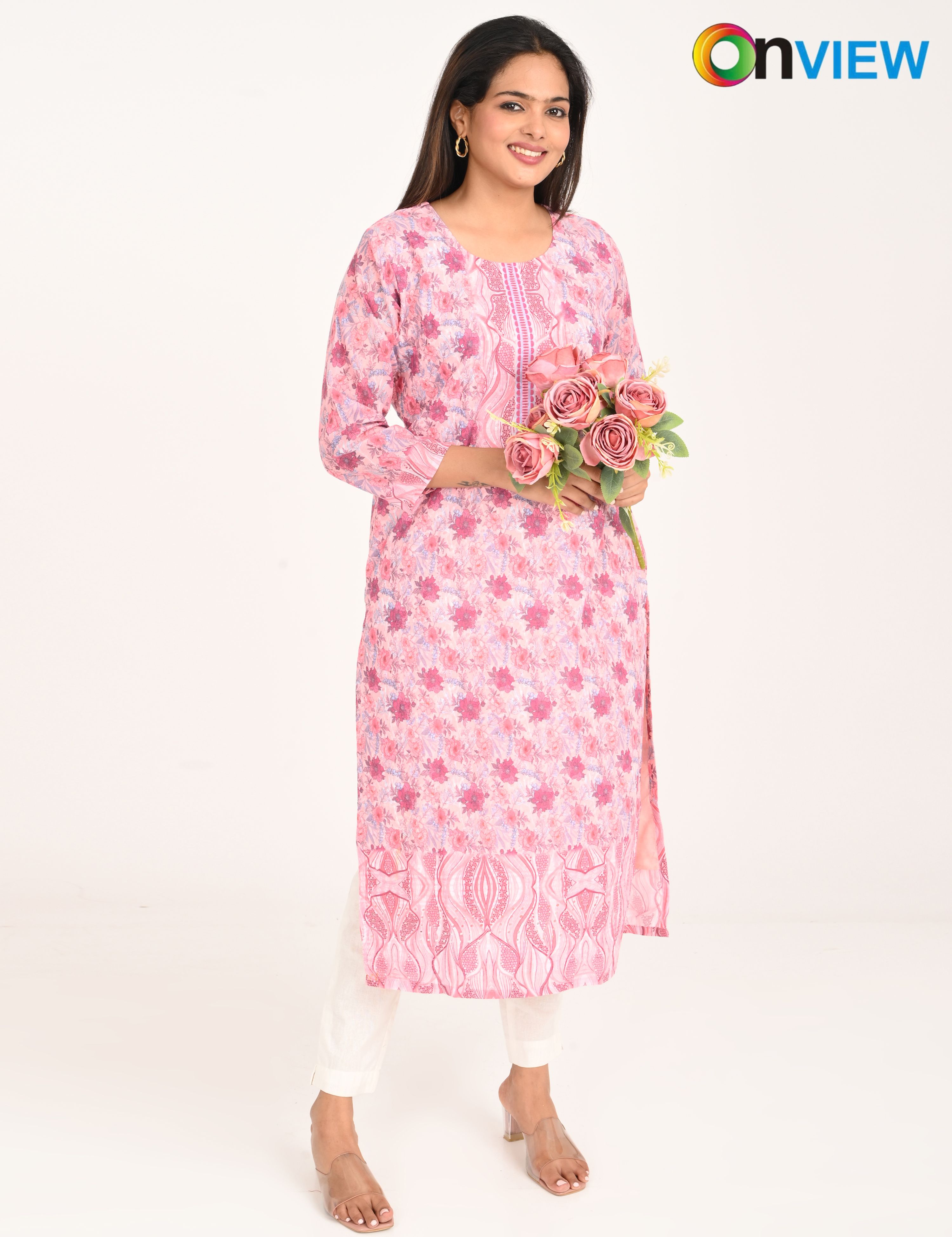 The Onview Cotton Chikankari Work With Digital Print is a sophisticated blend of luxurious fabric and delicate craftsmanship, designed to elevate your style effortlessly. Made from premium-quality silk, this kurti boasts a rich texture and an elegant sheen that exudes opulence, making it a perfect choice for special occasions or everyday elegance.
