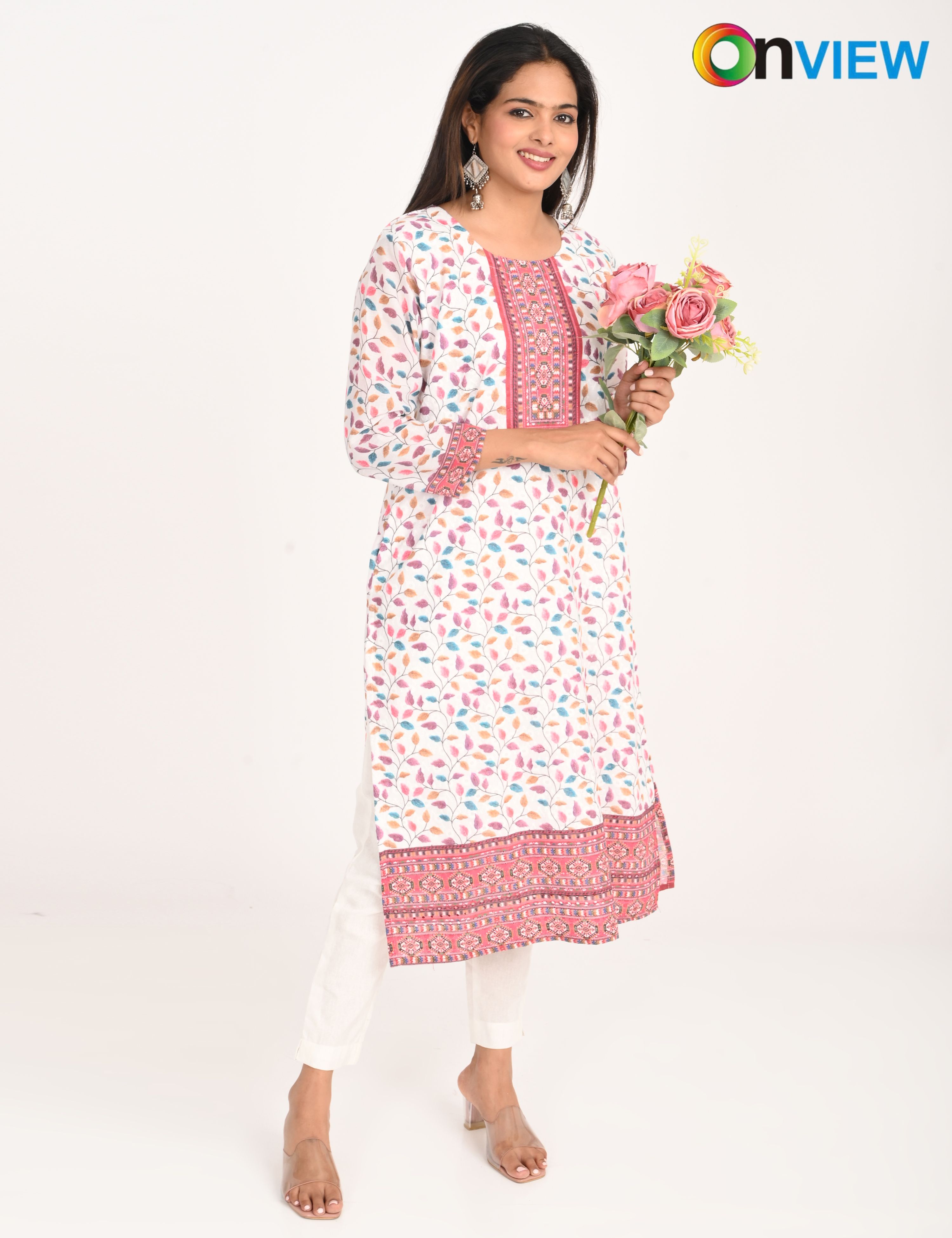 The Onview Cotton Chikankari Work With Digital Print is a sophisticated blend of luxurious fabric and delicate craftsmanship, designed to elevate your style effortlessly. Made from premium-quality silk, this kurti boasts a rich texture and an elegant sheen that exudes opulence, making it a perfect choice for special occasions or everyday elegance.