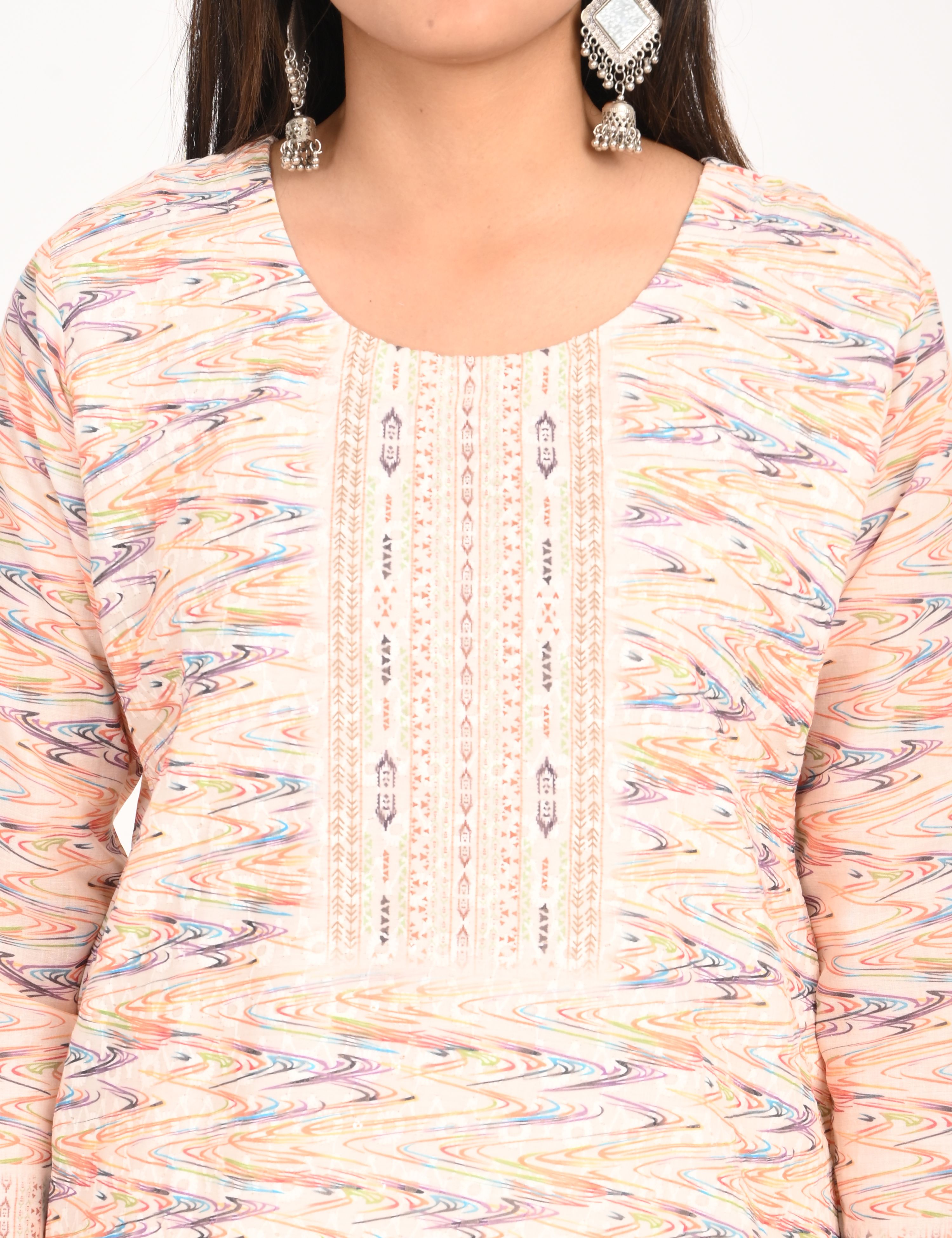 The kurti is adorned with subtle, intricate embroidery that adds a touch of grace and refinement. The small embroidery patterns are thoughtfully placed, creating a harmonious balance that enhances the overall design without overwhelming its simplicity. This design approach makes it versatile, suitable for festive gatherings, casual outings, or even formal office wear.